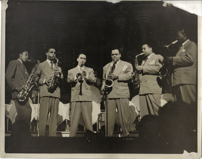 Photo of The Killer Saxes. Ben Kynard is second from the left. Arnett Cobb is shown third from the right. Lionel Hampton Orchestra circa 1946-48. Courtesy of the Brett Kynard Family.